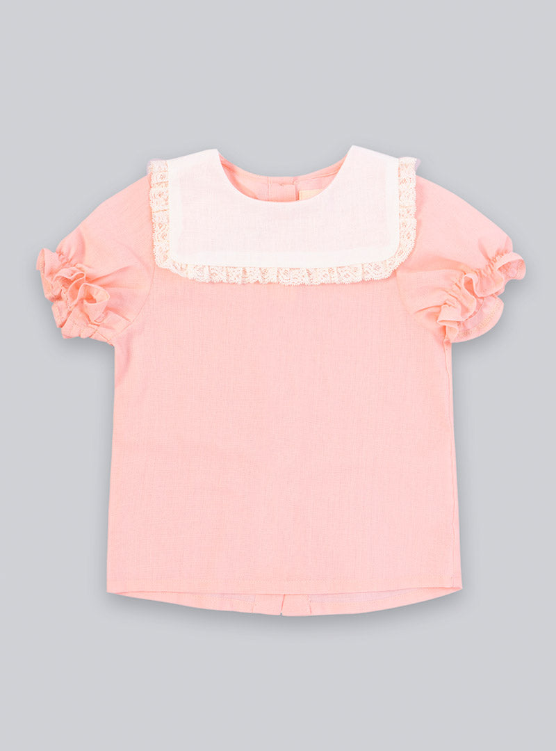 Blusa en color rosa con cuello marinero blanco con detalles de puntilla valencienne. Espalda abotonada.