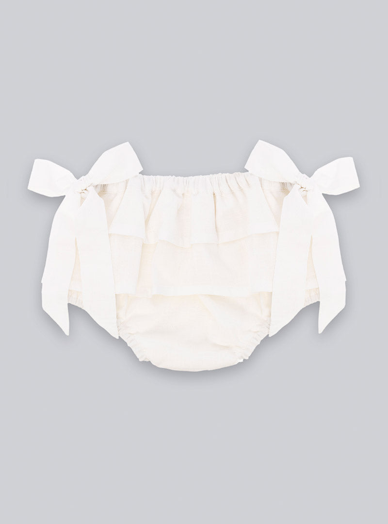 Braguita de color blanco roto con lacitos en los laterales. Van forradas