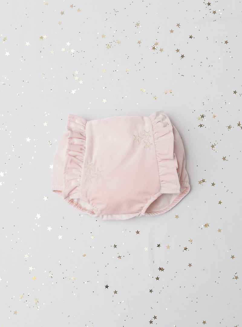 Braguitas de terciopelo en color rosa palo. Con volantitos y un bordado dorado delante.