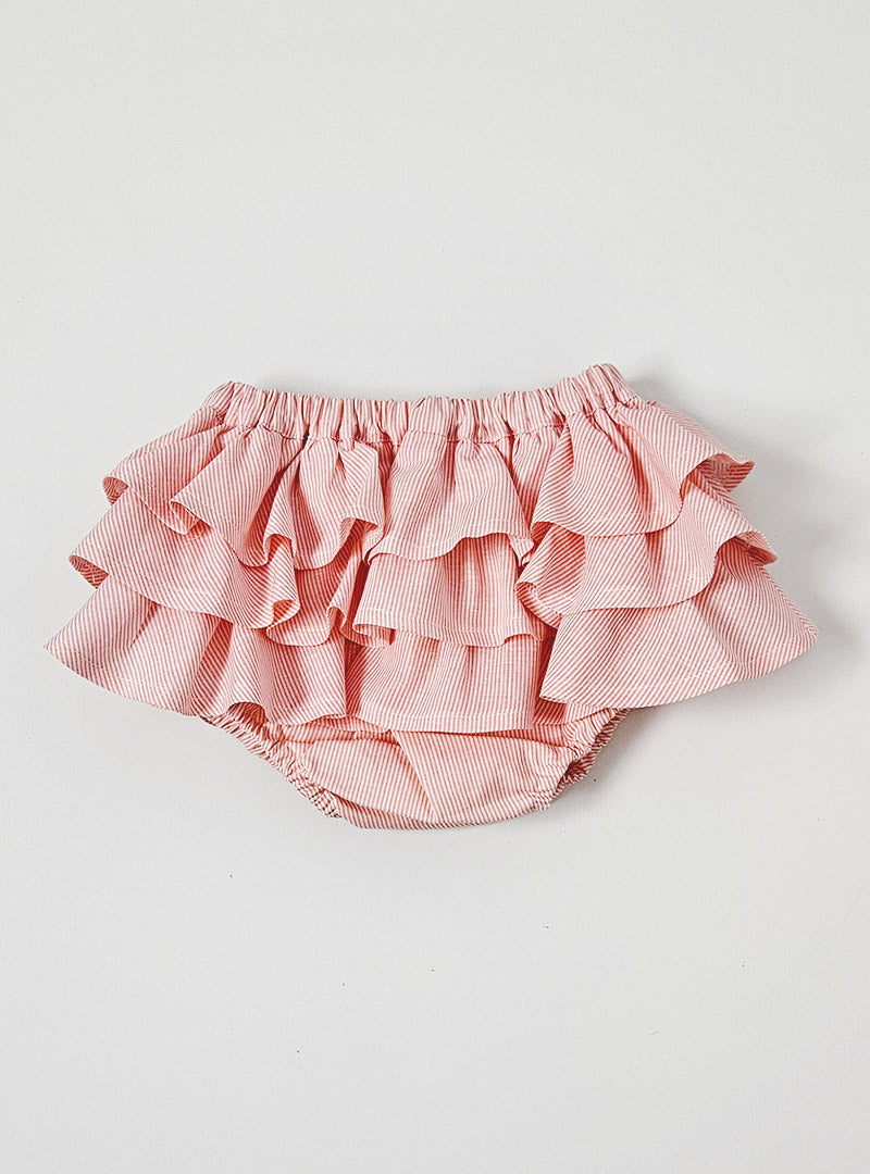 Braguita de tres volantes con rayas en color fresa. Forradas