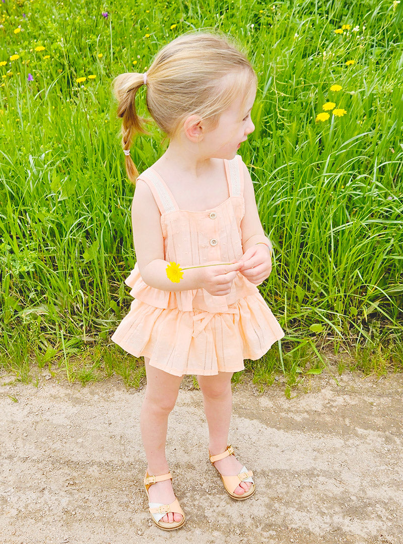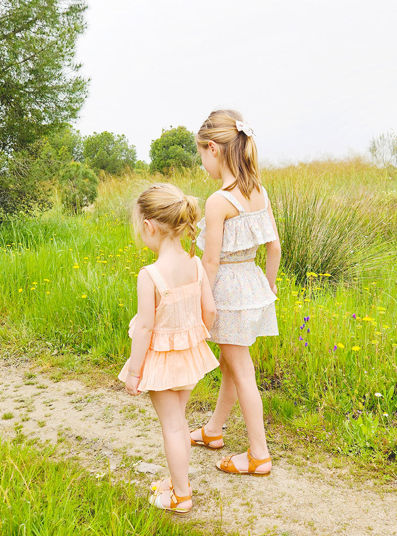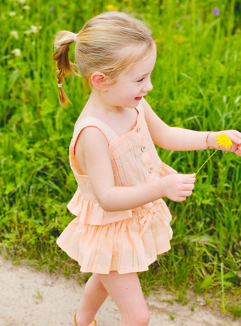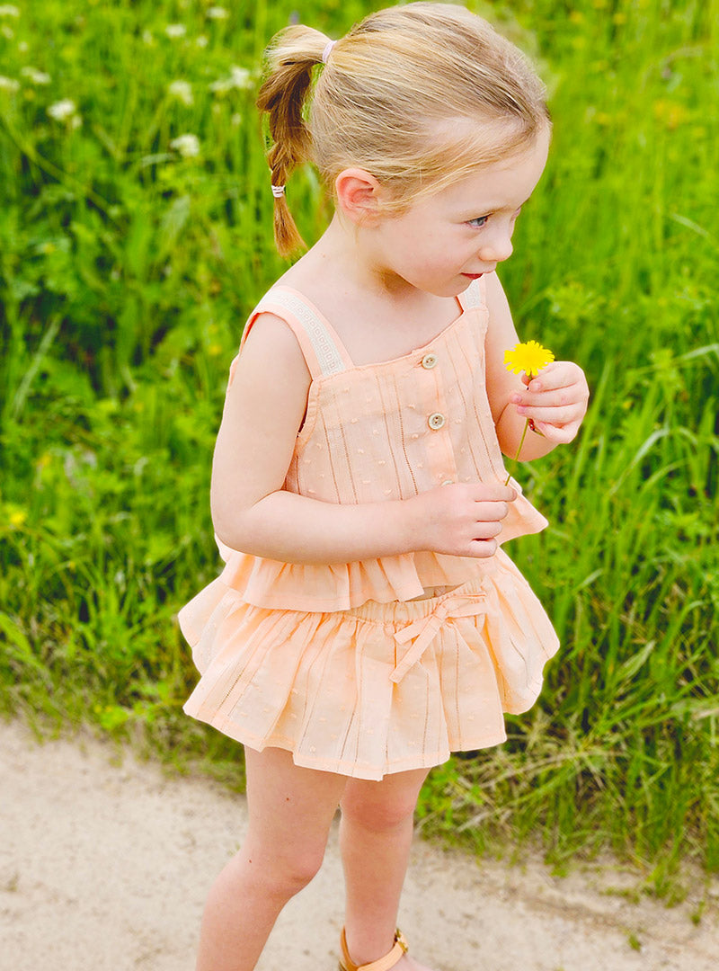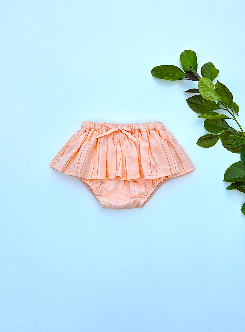 Braguita de color naranja en tejido de algodón con detalles de vainica y plumeti. Lacito decorativo en la parte delantera. Van forradas.
