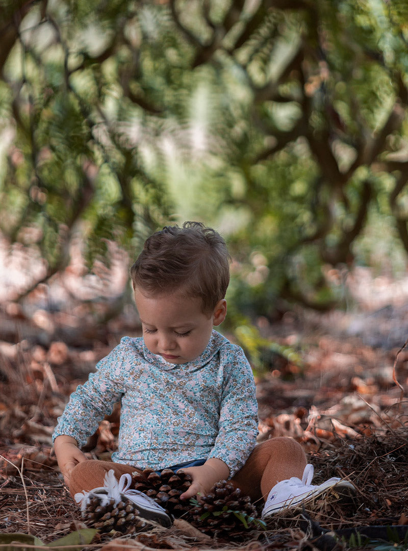 Camisa cuello bebé con florecitas en tonos verde agua y marrones. Lleva dos bolsillitos delante. La espalda va completamente abotonada.