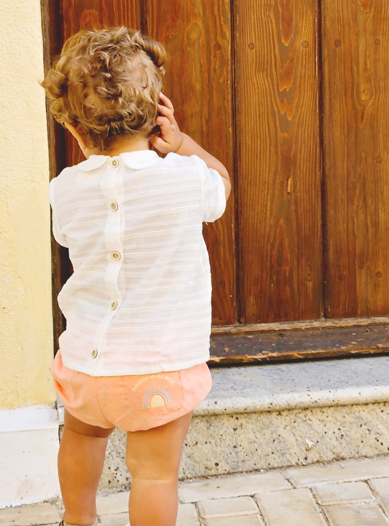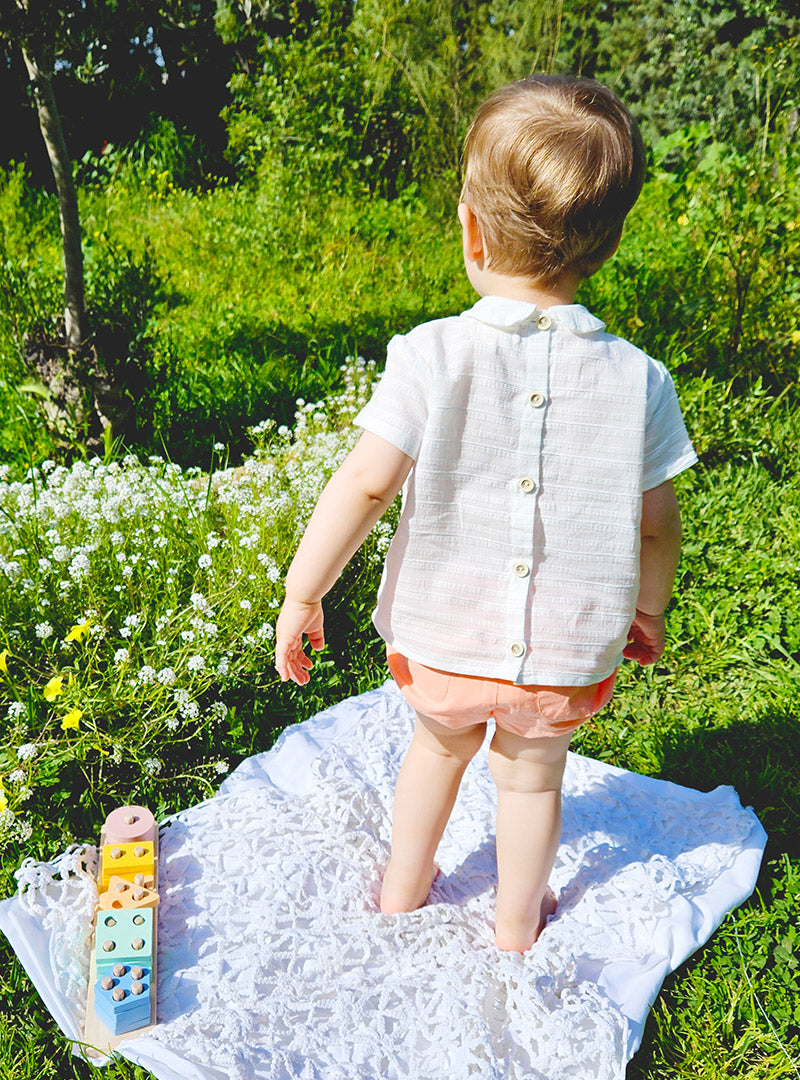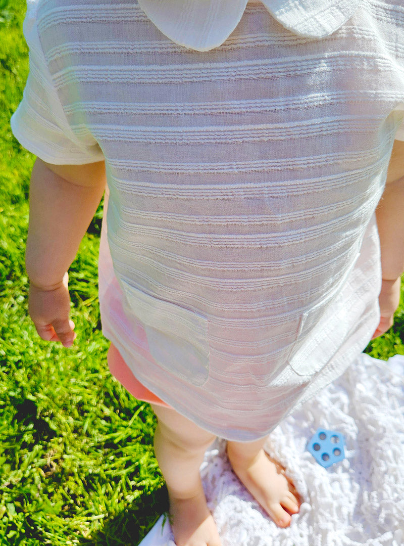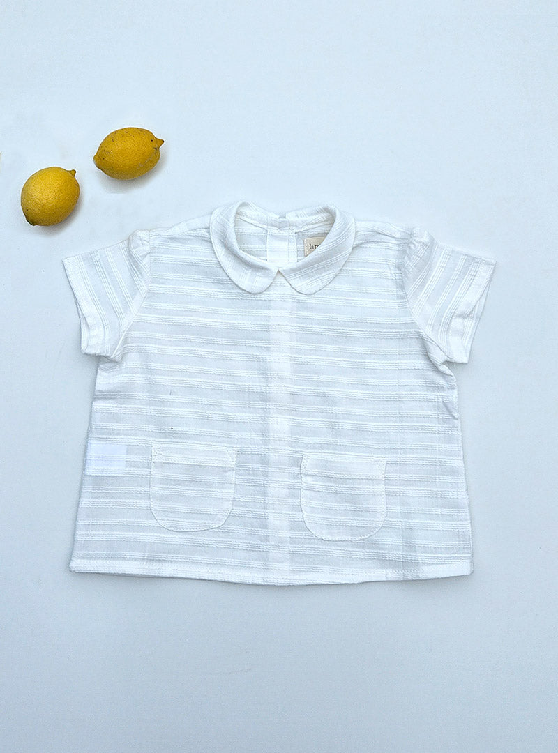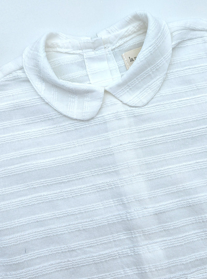 Camisa con cuello bebé en color blanco roto con detalles de rayitas en horizontal. La espalda va abotonada de arriba a abajo.