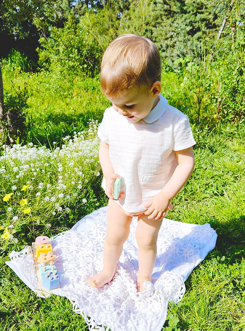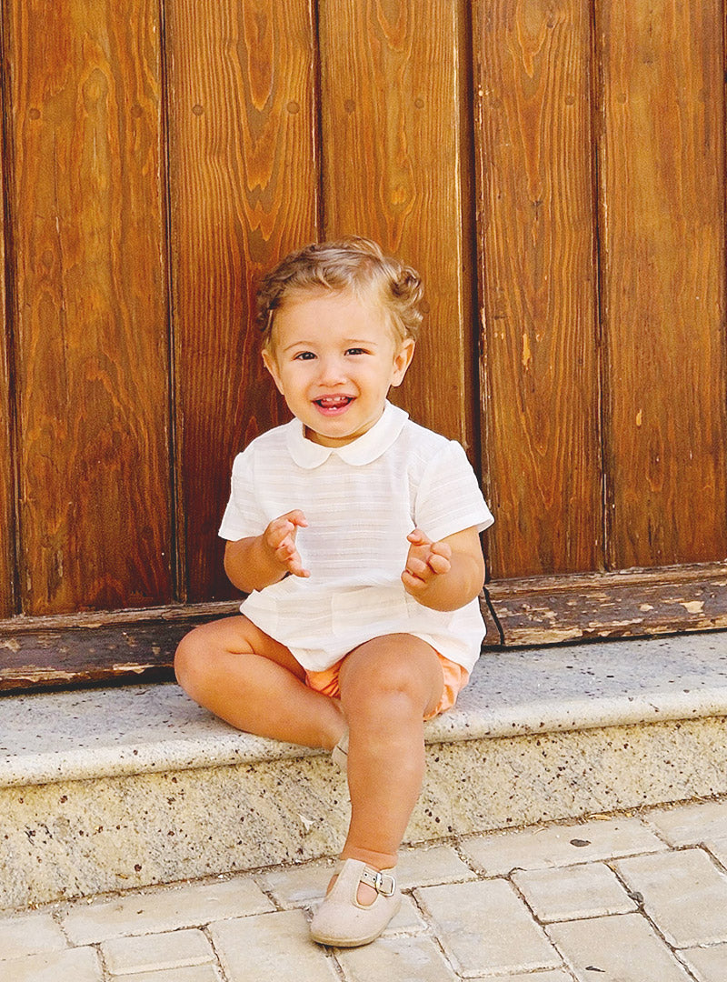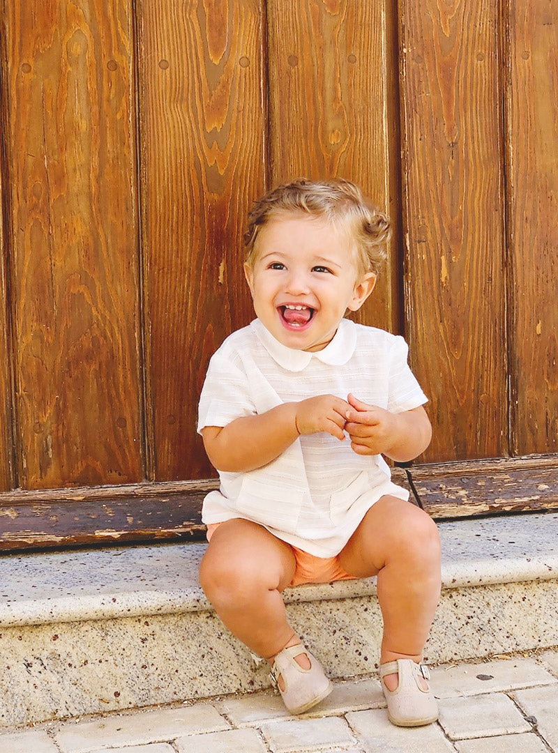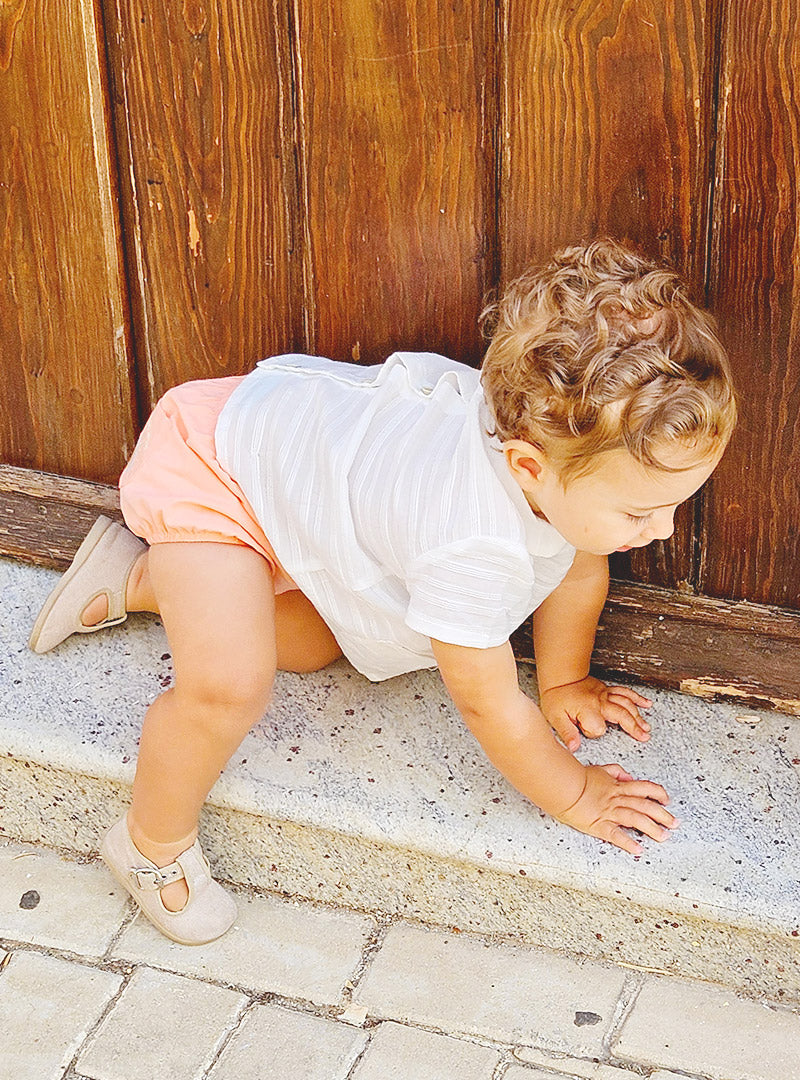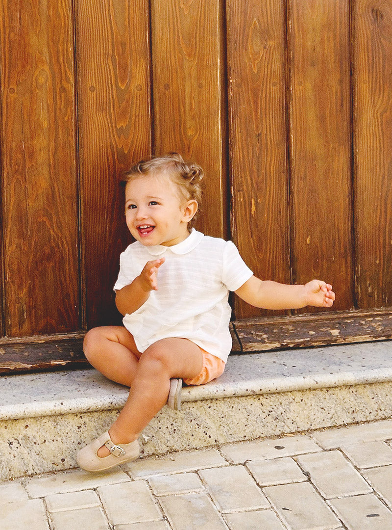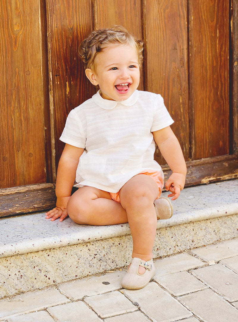 Camisa con cuello bebé en color blanco roto con detalles de rayitas en horizontal. La espalda va abotonada de arriba a abajo.