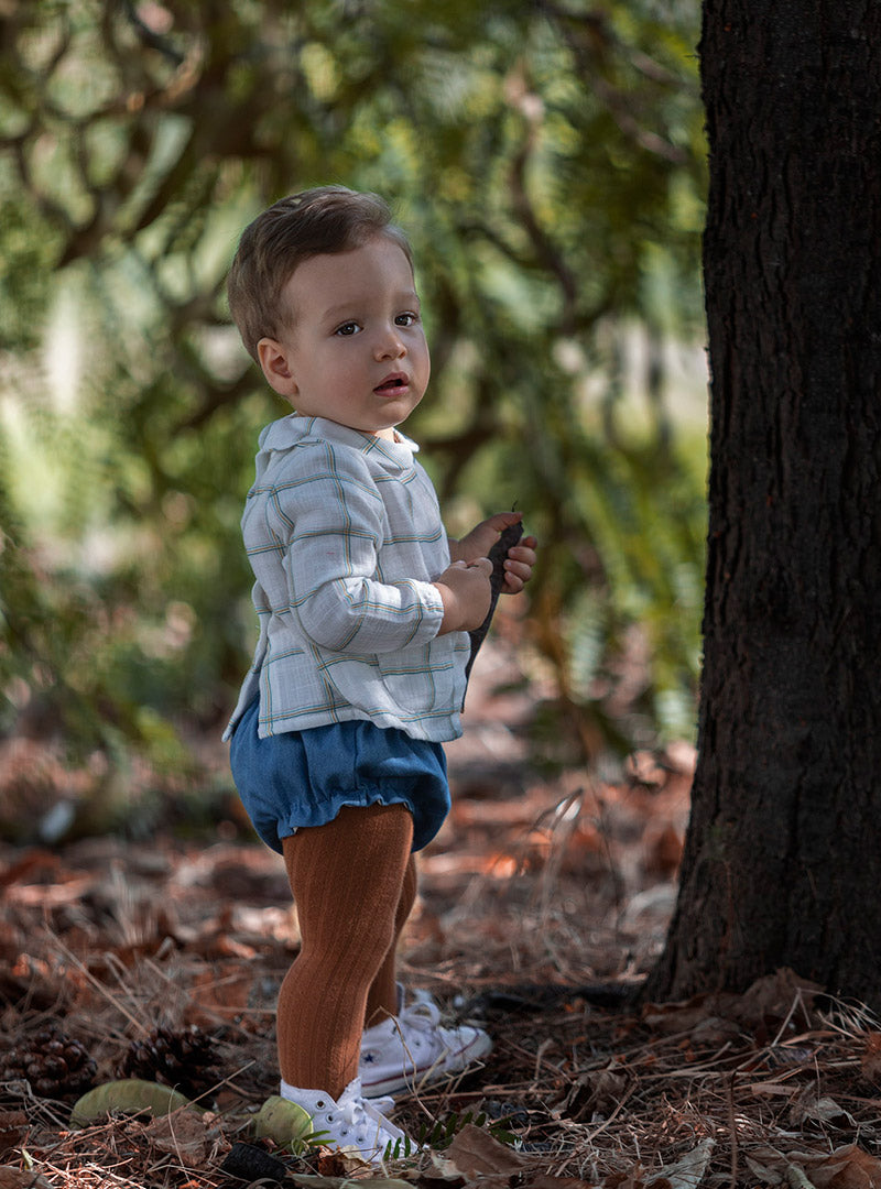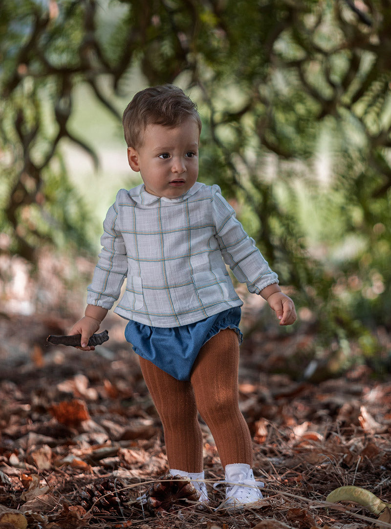 *Nuestro bebé modelo pesa 12kg/17 meses y lleva 18m de camisa y talla 9/12m de pololo.