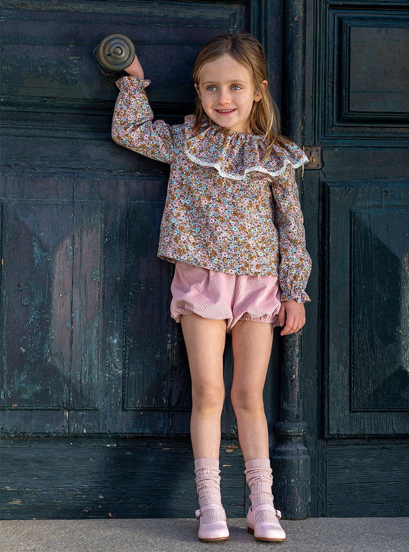 Camisa estampada de flores con un gran volante. Lleva puntilla valencienne. Abotonada detrás.