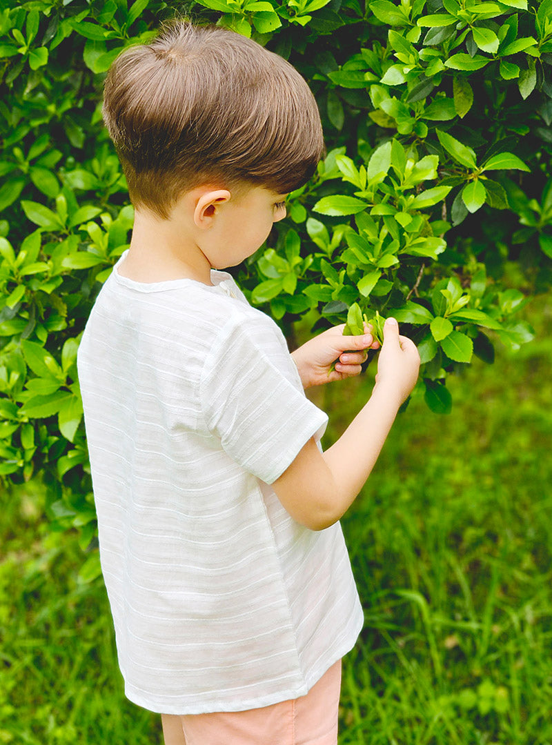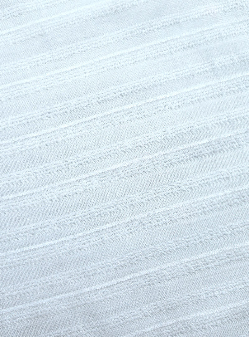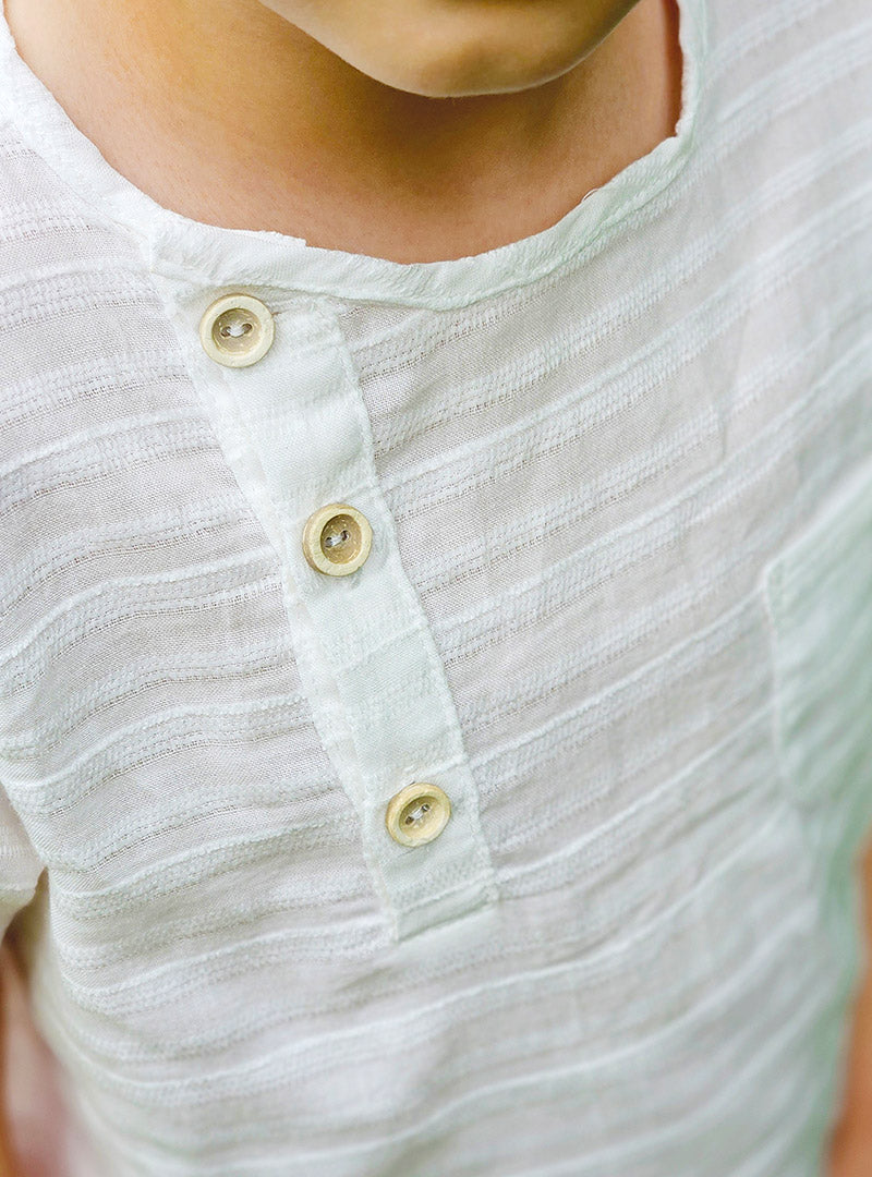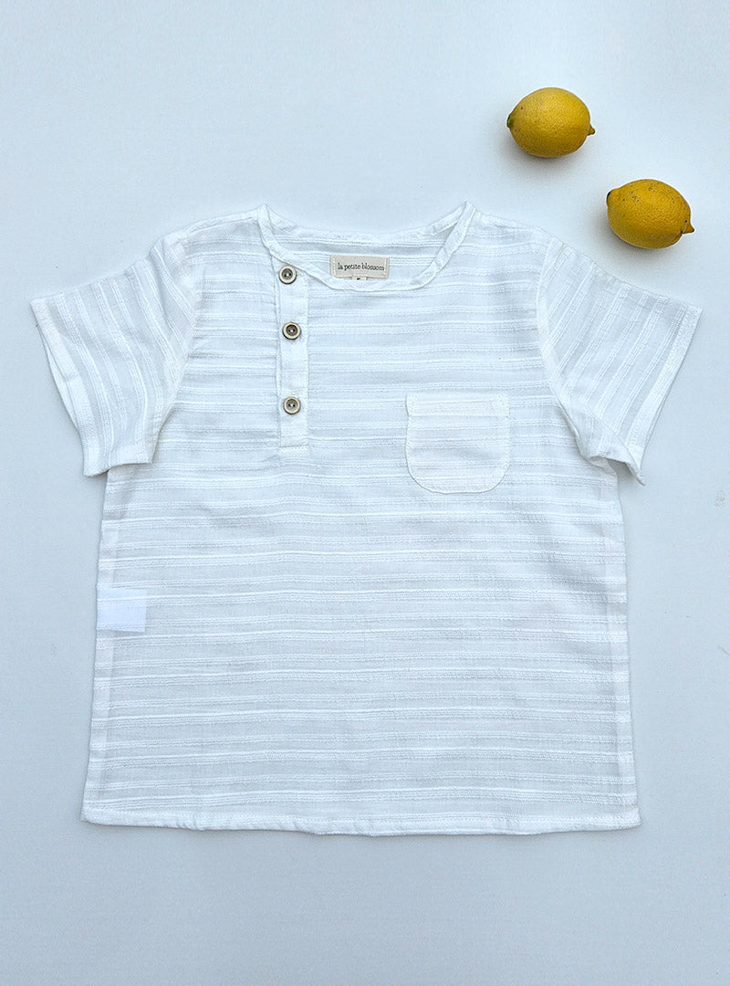 Camisa en color blanco roto con detalles de rayitas en horizontal. Abotonada a un lado y con un bolsillito.