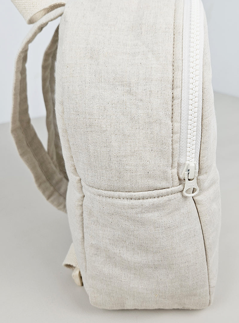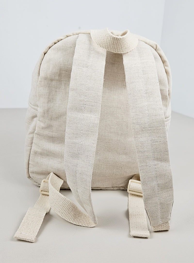 Mochila de lino de algodón acolchada. Interior de algodón. Cuenta con asas ajustables que se adaptan al crecimiento del niño y tirador superior para poder colgar. Perfecta para la guardería, paseos o pequeñas aventuras diarias.