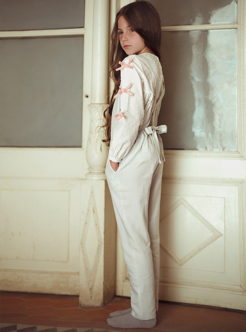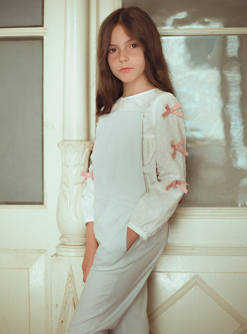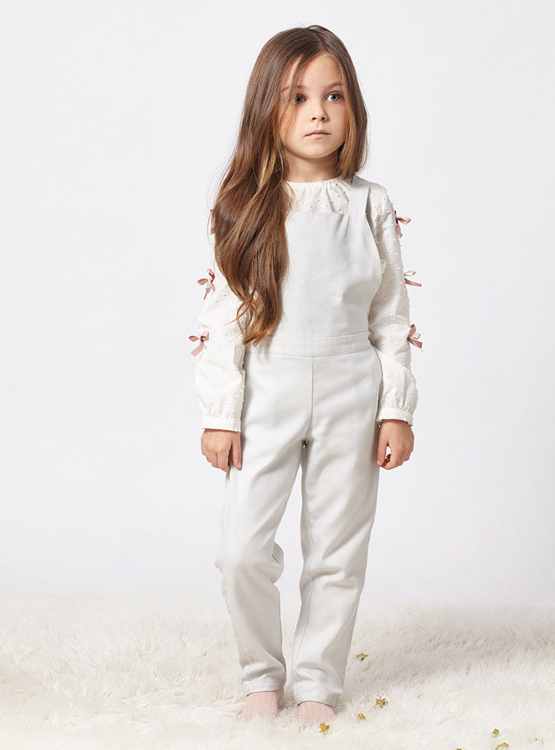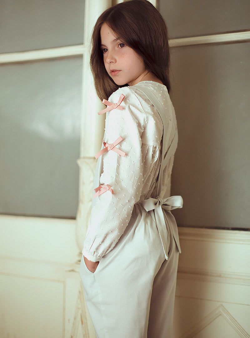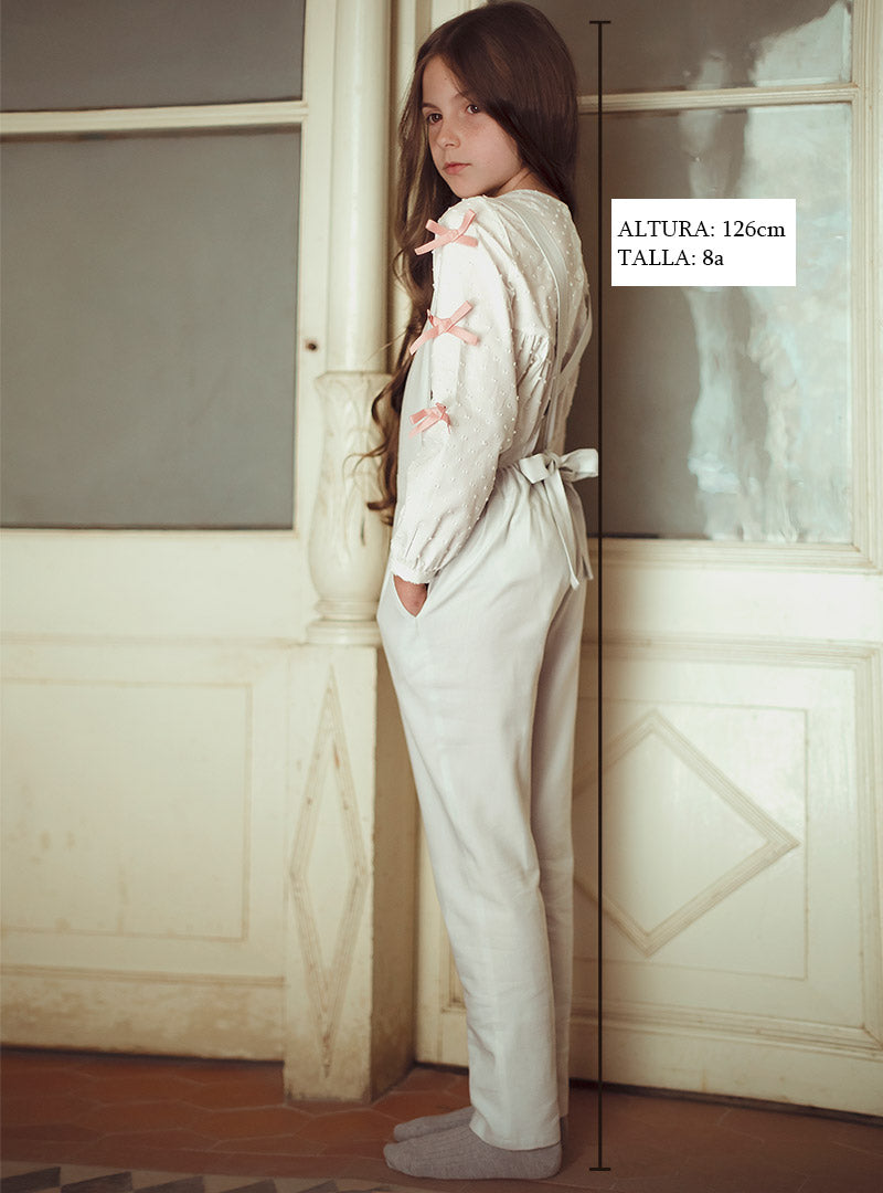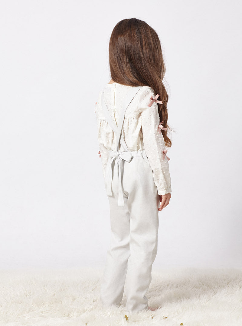 Mono en color gris con tirantes que se anudan detrás para cerrar lo que permite regular el largo.