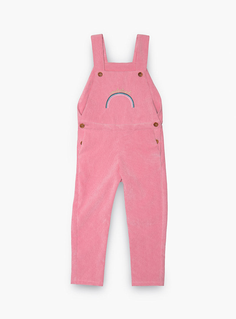 Mono de pana en color rosa con bordado de arcoíris delante. Se abrocha delante con botones. Lleva botones a los lados para poder entrarlo mejor.