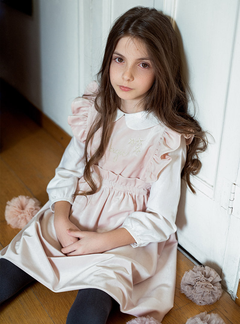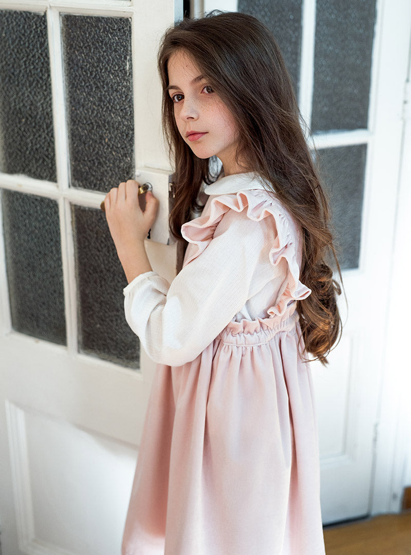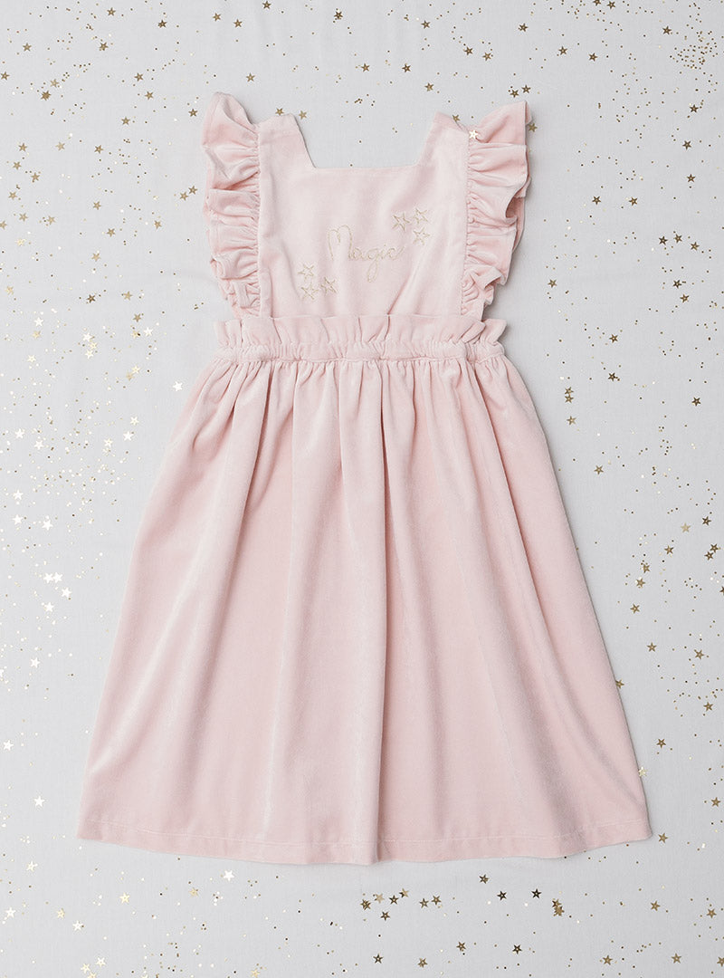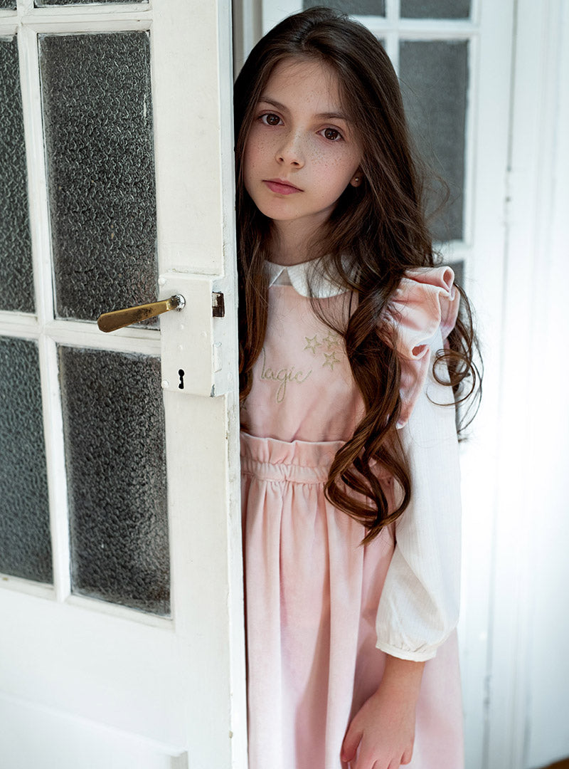 Pichi de terciopelo en color rosa clarito. Con bordado dorado delante.