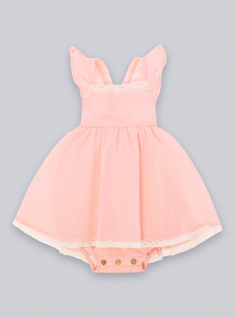 Ranita en color rosa. Lleva tirantes cruzados y detalles de puntilla valencienne. Va forrada.