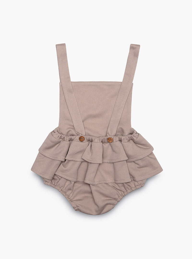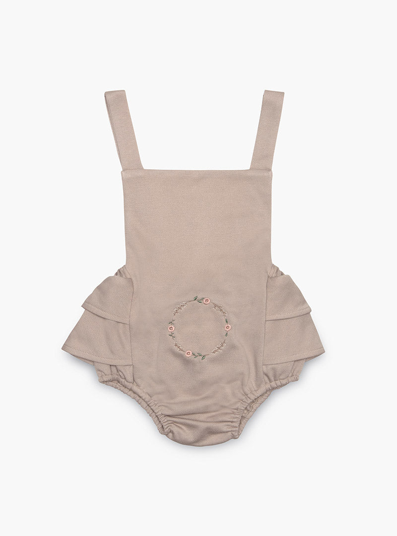Ranita de jogging con interior afelpado. Color tostado con un bordado de flores en el delantero y volantitos en el trasero. Se abrocha en la parte trasera con botones.
