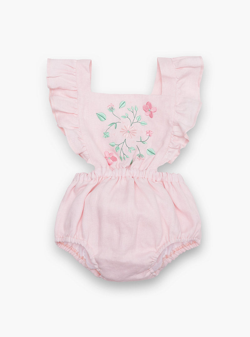 Ranita de lino en color rosa con bordado en la parte delantera. Se cierra detrás con botones.