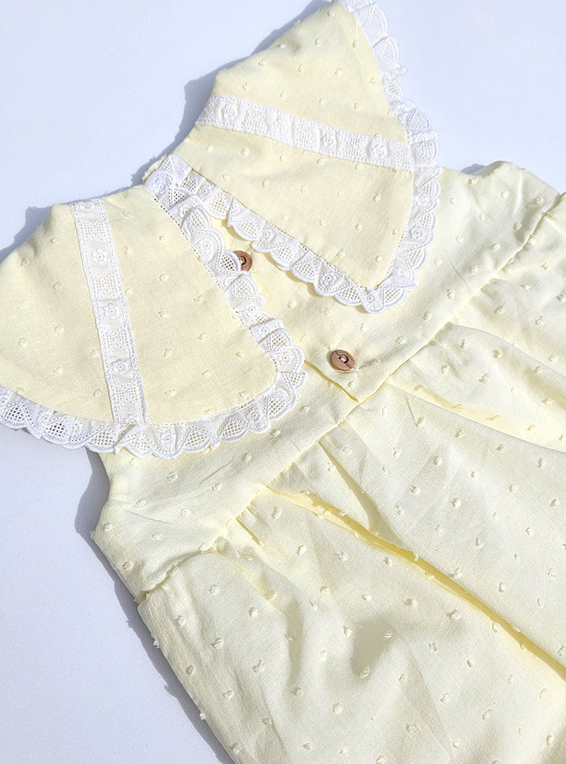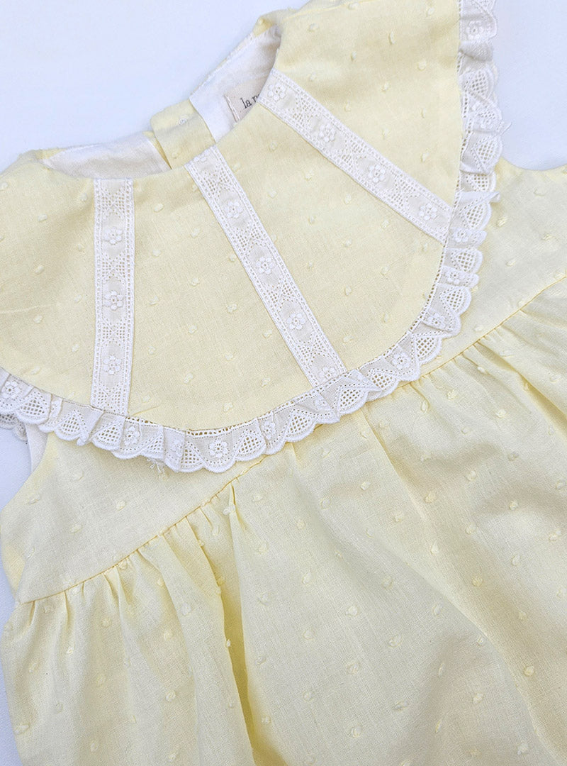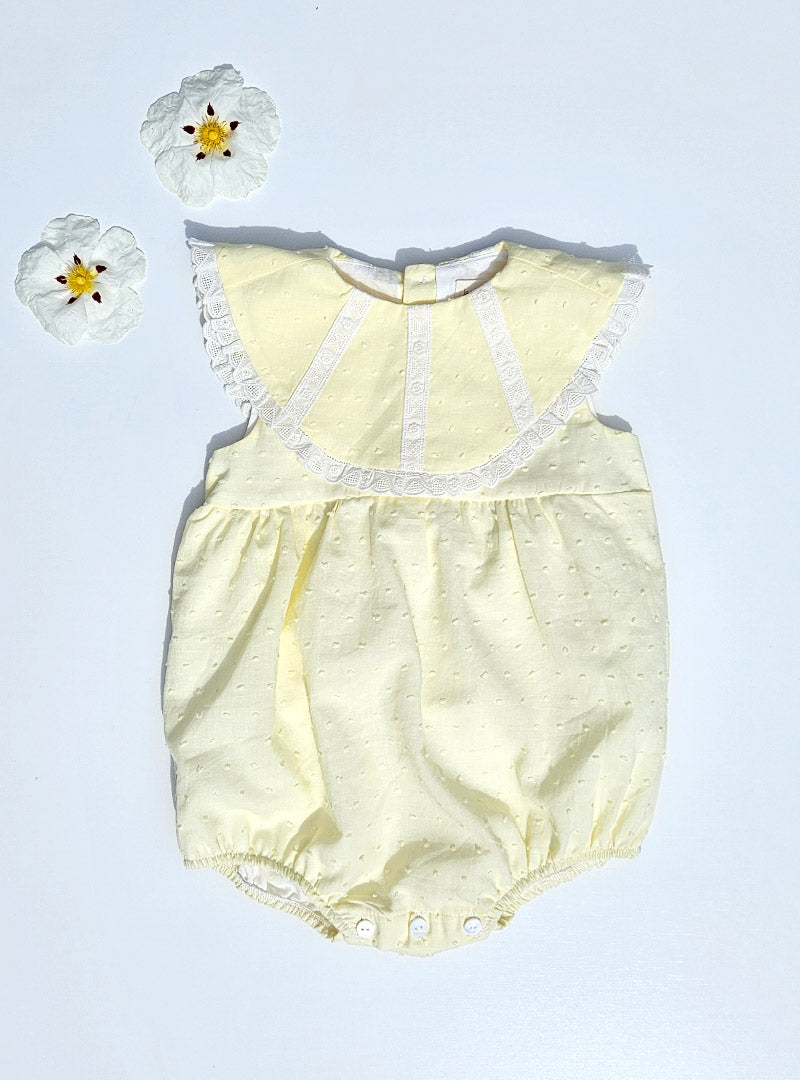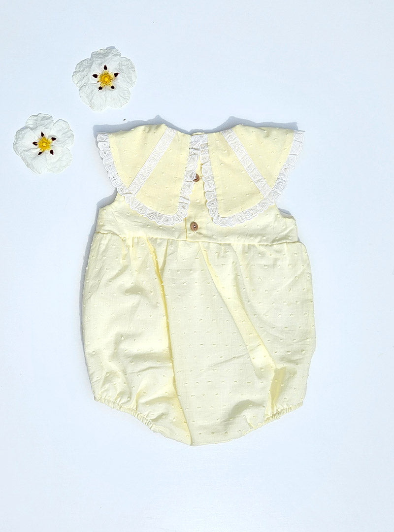 Ranita de color amarillo pastel con cuello y detalles de puntilla bordada de algodón. Abotonado detrás y abajo para facilitar el cambio de pañal. Va forrada.