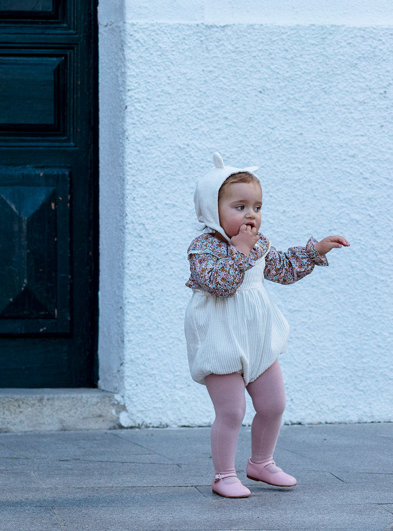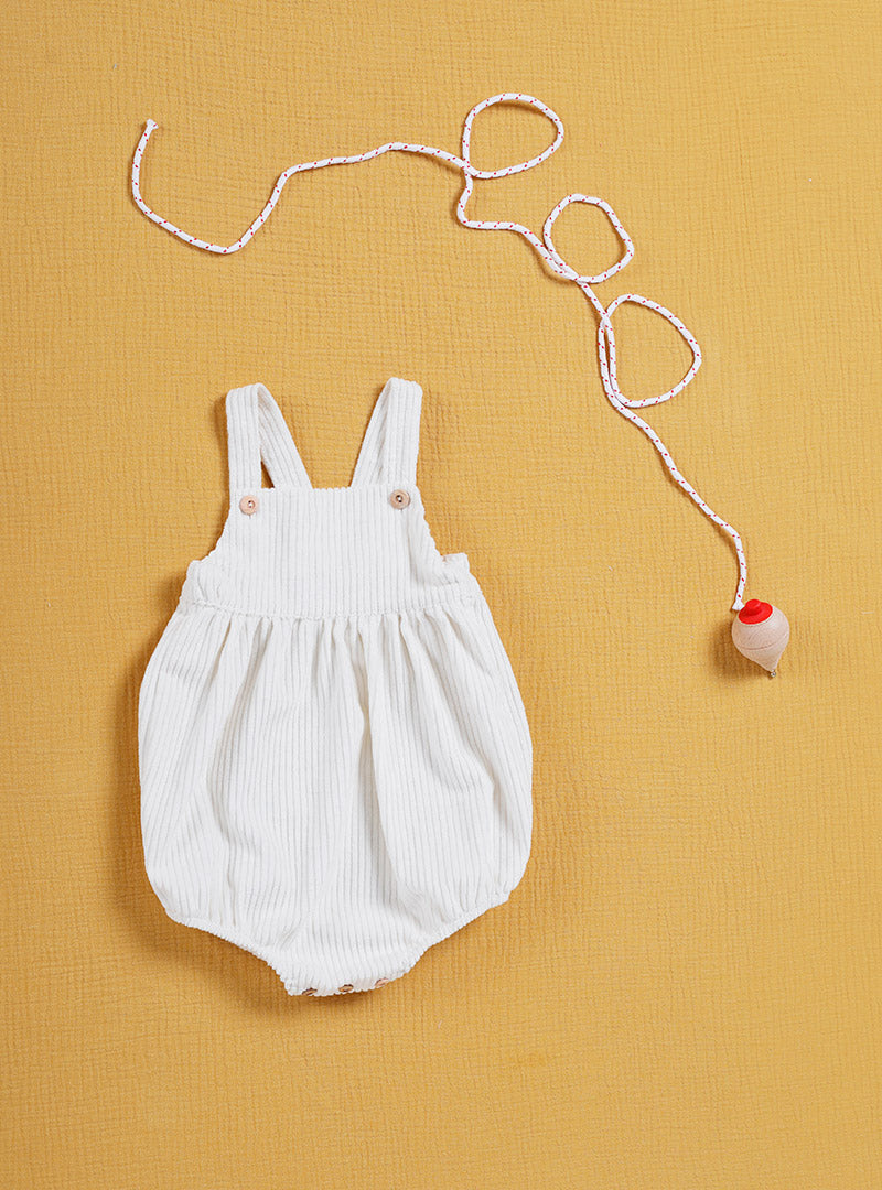 Ranita de pana en color crudo. Se abrocha delante, detrás tiene goma elástica para que se ajuste. Lleva botones en la parte de abajo.
