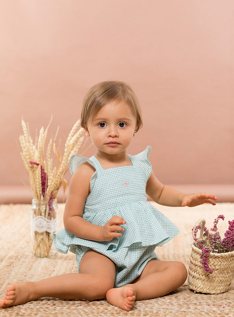 Ranita de vichy con tirantes cruzados. La espalda lleva una goma elástica. Va forrada.