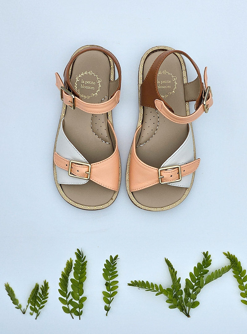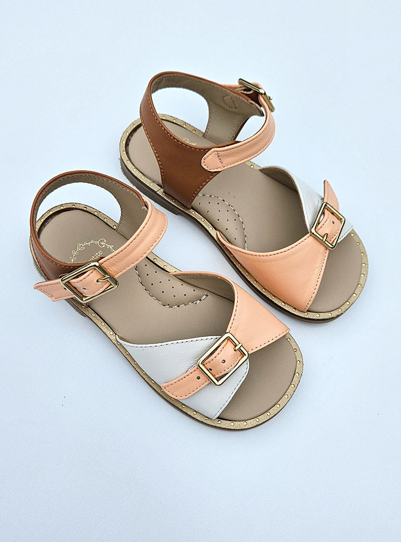 Sandalias de piel en tres colores con hebillas metálicas en color dorado.