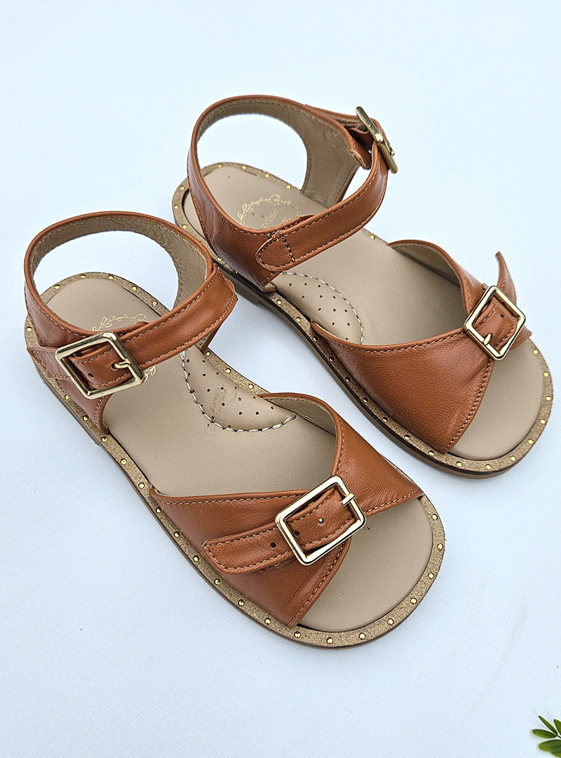 Sandalias de piel en color marrón con hebillas metálicas en color dorado.