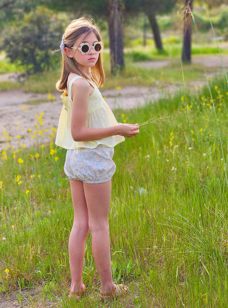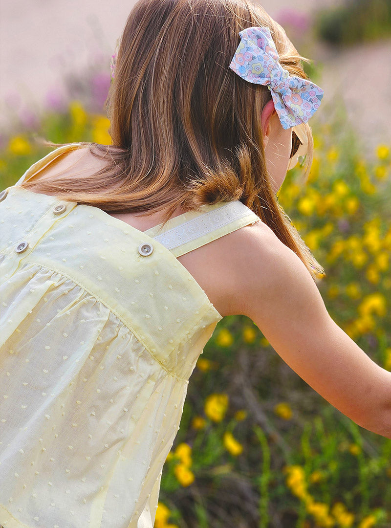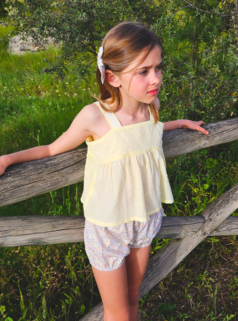 Top de color amarillo pastel de plumeti con detalles de puntilla bordada de algodón en los tirantes. Los tirantes se abrochan detrás y el botón va en el tirante por si lo tienes que mover más arriba o abajo.