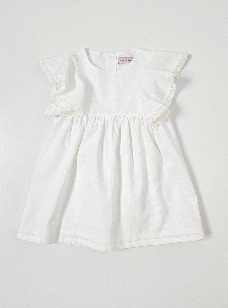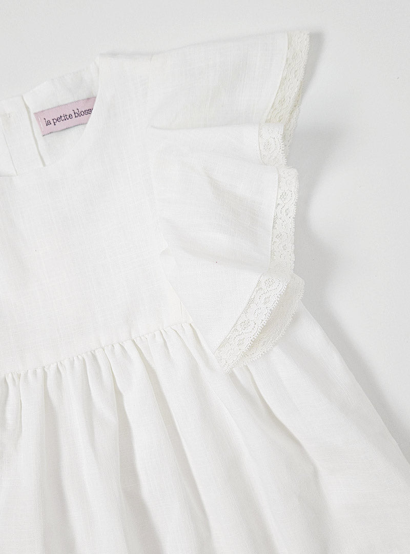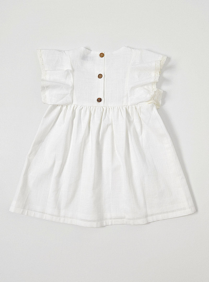 Vestido de color blanco roto con detalles de puntilla valencienne. Va forrado.