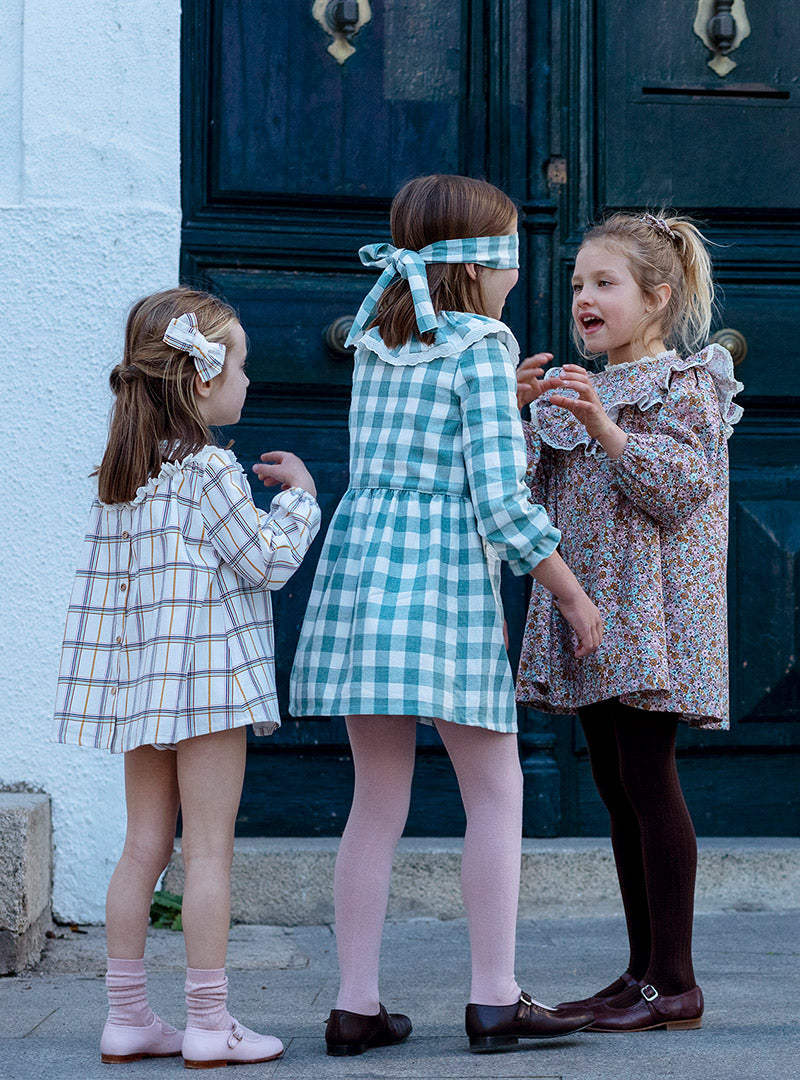 Vestido de cuadros con detalles de puntilla en el canesú. Va forrado.